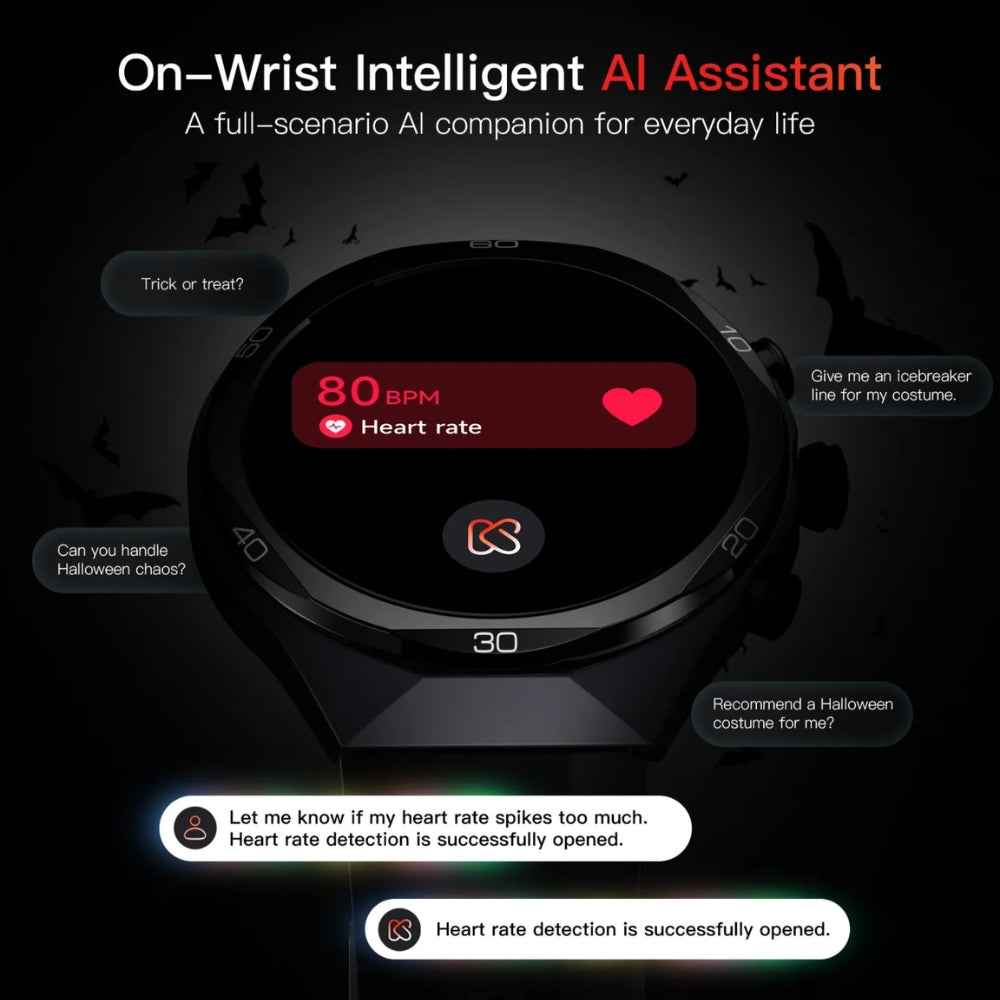 This is the campaign's core Unique Selling Proposition (USP). The watch features an On-Wrist Intelligent AI Assistant (Kieslect GPT) that acts as a full-scenario companion. The AI goes beyond simple commands, answering complex, creative queries like "Recommend a Halloween costume". It also demonstrates advanced health integration by allowing users to ask for alerts regarding high heart rate spikes. This highlights that the watch doesn't just track data; it actively processes user input and context.