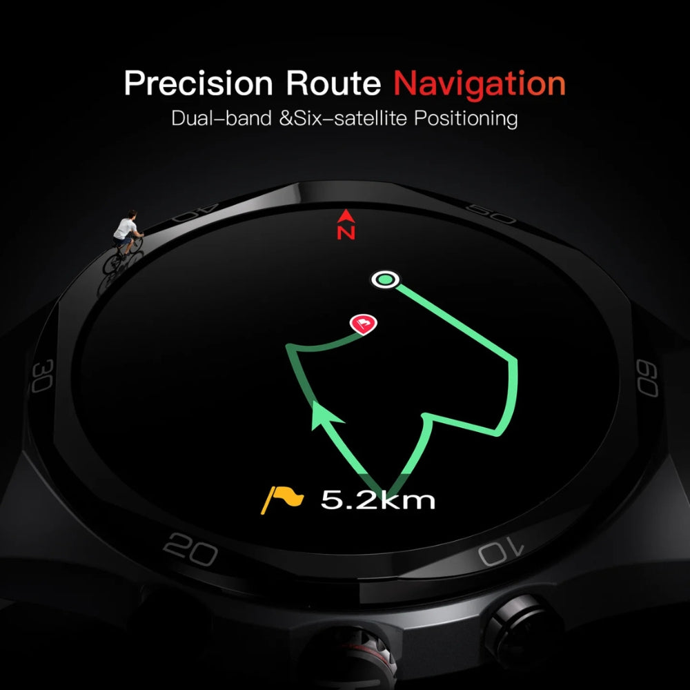 This asset focuses on the watch's professional-grade performance capabilities. The Elite2 features Precision Route Navigation powered by Dual-band and Six-satellite Positioning. This ensures incredibly accurate location tracking—essential for serious runners or cyclists in complex terrain. The visual clearly shows the ability to follow a precise, pre-set 5.2km route.